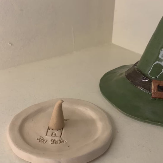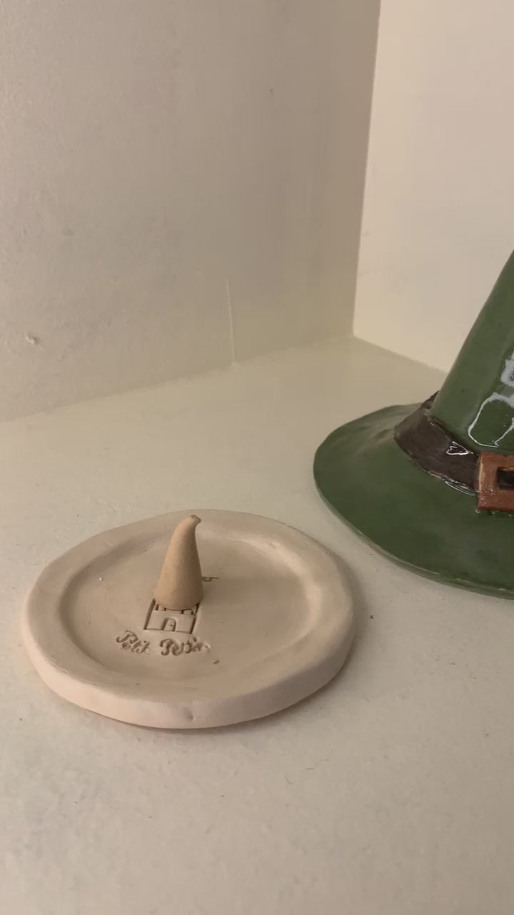 Brûleurs d'encens cône en forme de châpeaux. Livrés avec la petite coupelle pour le cône ainsi qu'un cône d'encens. Faience, engobes de couleurs et émail transparent.